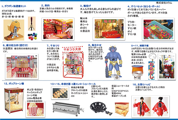 ステージ・テント・机・椅子などの設営備品綿菓子、ポップコーン、クレープなどの飲食出店品射的、ふわふわトランポリン、もぐら叩きなどの遊具まずは、イメージをご相談ください。