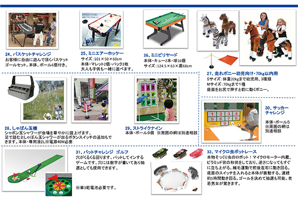 また、トランポリンや汽車などの、管理が必要な施設に関しましても、運営サポートを含めレンタルをご用意しております。