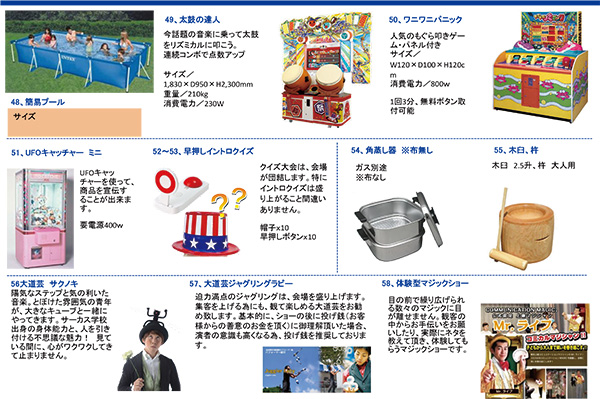ステージ・テント・机・椅子などの設営備品綿菓子、ポップコーン、クレープなどの飲食出店品射的、ふわふわトランポリン、もぐら叩きなどの遊具まずは、イメージをご相談ください。